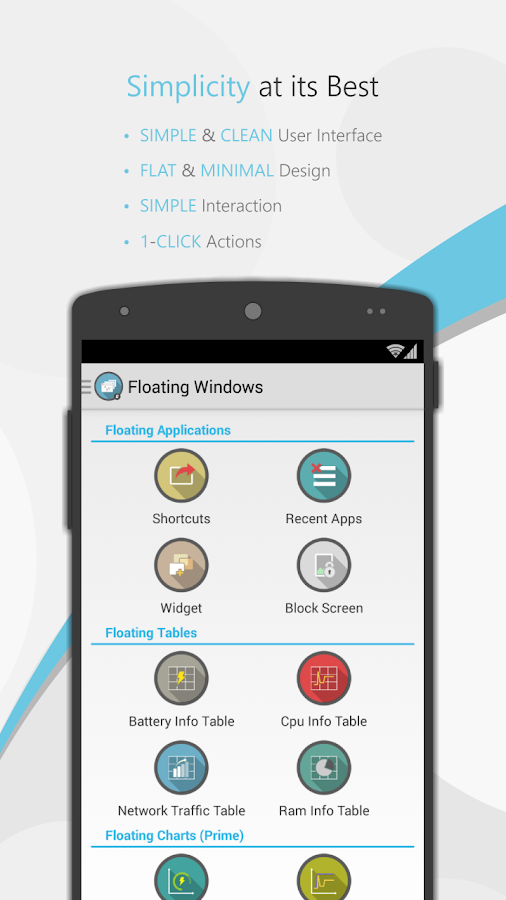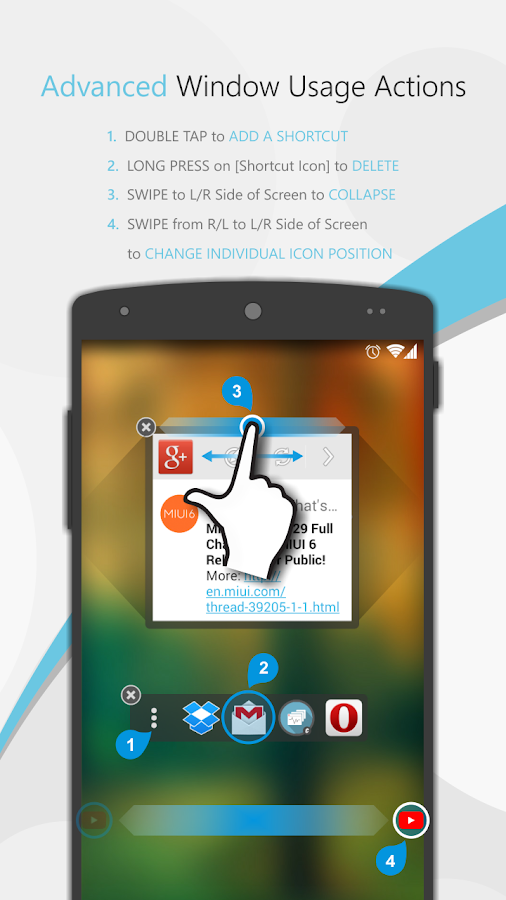 An intuitive multitasking solution which allows you to assign any of your favorite widgets to its individual »Floating Windowpane« along with statistical and monitoring tools such as RAM and battery stats. Each window floats on top of all other applications, allowing interaction with multiple applications at a time. Resize and position each individual floating window to your likings. Keep track of your favorite Shortcuts and Recent Applications and conveniently launch them through the Floating »Sidebars«, on top of any other application.