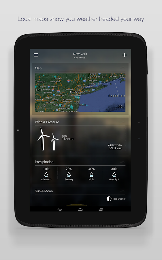 - Get all the details: wind, pressure, and chance of precipitation.